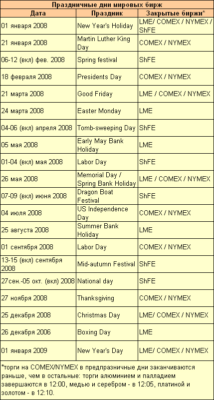 | * В предпраздничные дни торги прекращаются раньше указанного времени: торги алюминием и палладием завершаются в 12:00, медью и серебром - в 12:05, платиной и золотом - в 12:10. Предпраздничным считается любой рабочий день, предшествующий праздничному. | |||