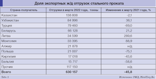 Наибольшие месячные потери (-45,8%) понесла ж/д отгрузка готового стального проката, прямо попавшего под санкции ЕС (табл. 1).