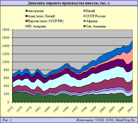 В отличие от мировых рынков алюминия и меди, на никелевом рынке китайская экспансия последних десятилетий не так заметна. Хотя Китай и совершил потрясающий шаг вперед: за 1985–2010 гг. выпуск электролитического никеля вырос с 20 тыс. до 300 тыс. т (рис. 1), однако отсутствие богатых месторождений данного металла сильно сдерживает развитие промышленности. Добыча никеля в КНР быстро выросла с 20 тыс. до 80 тыс. т, но уже 6 лет стоит на этом уровне. Китайские производители с 2005 г. занялись масштабной переработк... ... ...