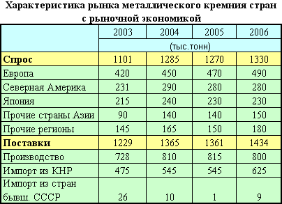 Поставки металлического кремния на рынки стран с рыночной экономикой, по данным "Mitsubishi Trading", повысились в 2006 г. на 5% - до 1,43 млн. т. На экспорт из КНР, а также стран бывшего СССР/Восточной Европы приходилось соответственно 44 и 1% суммарных поставок.