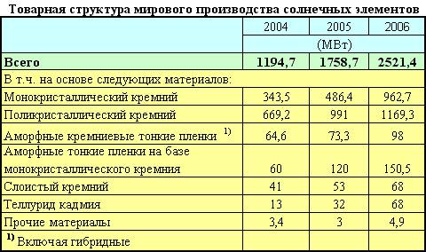 В 2006 г. суммарный мировой выпуск солнечных элементов на основе кристаллического кремния (монокристаллического, поликристаллического и аморфных тонких пленок на базе монокристаллического кремния) увеличился на 43% -до 2283 МВт, что соответствует 91% мирового производства солнечных элементов, при этом на продукты на основе монокристаллического и поликристаллического кремния приходилось соответственно 38 и 46%. Учитывая, что на получение 1 МВт энергии требуется примерно 10 т кремния, и допуская возможность 10%-ного двойного счета, мировой спрос на кремний в данной сфере в 2006 г. можно оценить в 21 тыс. т, что на 31% больше, чем в 2005 г. (16 тыс. т).