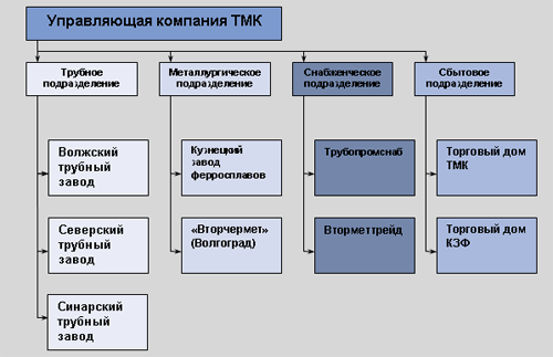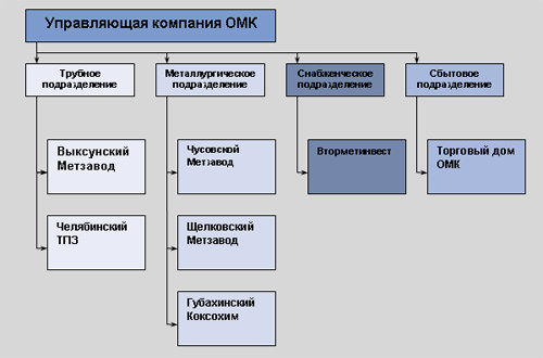 К 2001 году в России сформировались два устойчивых холдинга, контролирующие по разным оценкам по 25-30% каждый. Первый холдинг – ОМК – был сформирован «де-юре» еще в начале 90-ых, однако как самостоятельный игрок с прозрачной и согласованной в рамках входящих в холдинг предприятий сбытовой и маркетинговой политикой начал функционировать лишь около года назад. Сегодня в составе холдинга множество предприятий, основные из которых – Выксунский металлургический и Челябинский трубопрокатный заводы. Подробная схема холдинга представлена на рисунке 1.