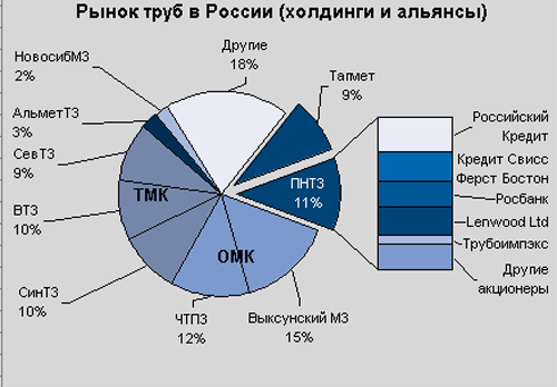 Рынок российских труб: передел еще не завершен Как было рассмотрено в наших предыдущих материалах, по итогам 2001 года российские трубники показали довольно неплохие результаты: практически все предприятия констатировали рост производства от 3 до 7%, а некоторые заводы, как, например, Борский трубный и НТЗ «Промет», и вовсе увеличили выпуск в разы. Однако большую часть стальных труб в настоящее время выпускают две российские компании-холдинга: ОМК и ТМК. Традиционно считается, что существующее в отрасли положение стабильно, однако происходящие несколько последних месяцев события заставляют сделать предположение, что такой паритет просуществует еще недолго и в скором времени в отрасли появиться еще один сильный игрок.