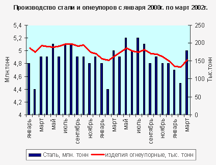Естественна прямая связь объемов производства огнеупоров с производством металла. Однако в итоге за 1999-2001 год падение производства огнеупоров в России превысило спад производства стали и достигло 15%. Причем спад 2002 года, во многом вызванный решением США об ограничении импорта стали (а позже – и других стран) вызвал дальнейшее падение спроса на вспомогательные материалы и сырье. Например, комбинат «Магнезит» за 5 месяцев 2002 года снизил объем производства огнеупоров уже на 16,9%.