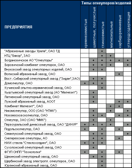 В таблице 1 приведены основные российские производители огнеупорных материалов и изделий и основная номенкура их продукции.