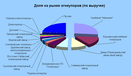 По состоянию на последние 3 года производства российский рынок огнеупоров весьма неравномерно распределен между основными предприятиями. Доля 15 ведущих предприятий по объему выручки приведена на Рис.1.