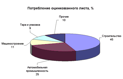 Около 45 % выпускаемого оцинкованного листа используется в строительстве (сюда входят и трубы, и профнастил, и кровля). Во Франции и в Германии этот показатель еще выше: в этих странах особенно широко применяется оцинкованная кровля.