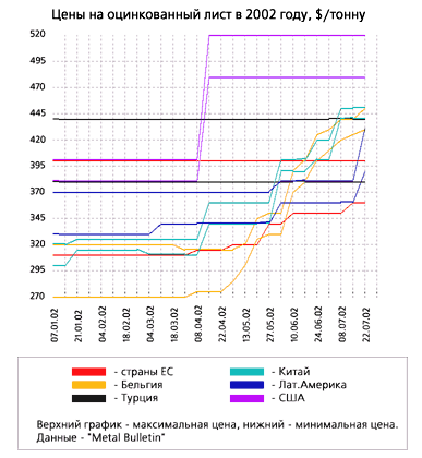 Однако решение президента США Джорджа Буша от 6 марта 2002 года о том, что подавляющее большинство наименований металлопродукции, поставляемой в США, облагается дополнительными пошлинами в размере от 15 до 30% вызвало «цепную реакцию» взаимных запретов и принципиально изменило ценовую ситуацию. Динамика мировых цен на оцинкованный прокат резко изменилась: