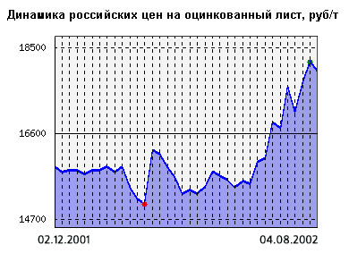 В России общий расход цинка на оцинкование составляет порядка 54 % от его объема выпуска и постоянно растет. Растет и российский спрос на оцинкованный металл. Однако производство оцинкованного проката в РФ с 1999 по 2000 год сократилось на 9,6 % - с 985 тыс. т до 899 тыс. т (хотя по данным Госкомстата в 2000 г. рост производства в черной металлургии в целом составил 15 % по сравнению с 1999 г.). Частично снижение выпуска было связано с падением цен на оцинковку, частично - с импортом дешевого проката из стран СНГ. Однако, под давлением растущего спроса, с начала 2001 года наблюдается рост выпуска оцинкованного проката в России. По итогам прошедшего года он составил порядка 946,2 тыс. т. Растет выпуск оцинкованного проката и в 2002 году. Частично это связано с быстрым ростом как мировых, так и российских цен в с апреля-мая этого года.