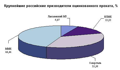 Основной спрос на оцинкованный прокат в России сейчас закрывается 4 ведущими производителями: ММК, Северсталью, НЛМК и Лысьвенским МЗ. Их доля на российском рынке приведена на графике 2.