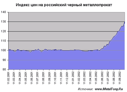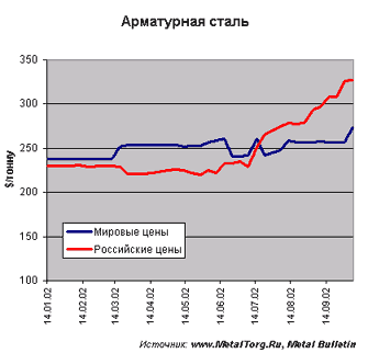 Особо показательным является тренд цен на российскую арматурную сталь. Она является лидером повышения цен на внутреннем рынке. Летний спрос со стороны стройиндустрии при резком ограничении поставок из Украины и Казахстана привел к стремительному росту цен. Увеличение их за последние полгода составляет 44 %. В России нет ни одного вида промышленной продукции столь быстро подорожавшей за последнее время.
