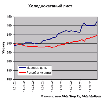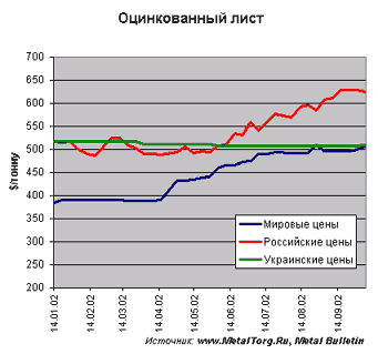 В 2002 г. цены на оцинкованный лист (широко применяемый в строительстве, автомобилестроение, машиностроении) по разным регионам мира увеличились на 6 - 30%. В России же цена на оцинковку, как была, так и осталась рекордсменом по отрыву от мировых цен.