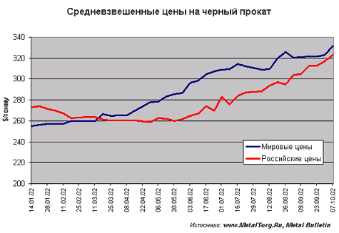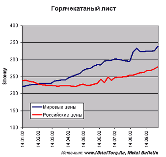 Причина столь небольшого повышения кроется и в ограниченном экспорте (наличие квот и низкое качество отечественного проката), и в стагнации спроса в России, например, в машиностроении. Не стоит забывать и об излюбленном, уже известном, приеме «запада»: вытеснить экспортную продукцию в сторону сырья и полуфабрикатов низкого передела. Так, в январе 2002 года Европейский Союз ввел запретительные квоты на импорт современного легированного бором проката из России, что снизило соответствующие поставки в 2-3 раза.