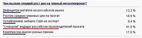 Кстати летний опрос посетителей сайта www.MetalTorg.Ru показал, что они считают основной причиной роста российских цен «сговор» ведущих производителей.