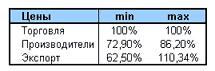 Приведенные выше цены соответствуют мелкооптовым рынкам продукции. Для справки приведем ниже соотношение цен для различных секторов торговли. Отметим, что порой экспортные цены являются крайне низкими, что наносит ущерб внутреннему рынку страны.