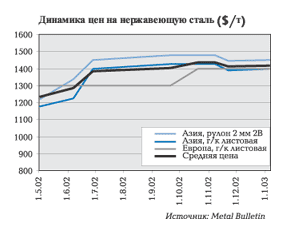 Увы, эти тенденции не породили в 2002 году «лавину» роста мировых цен на нержавейку и восстановление ее до предкризисного уровня, аналогично ходовому черному металлопрокату. В октябре средняя мировая цена на холоднокатаный нержавеющий прокат достигла 1516 долл. за тонну, а с ноября начался спад цен.
