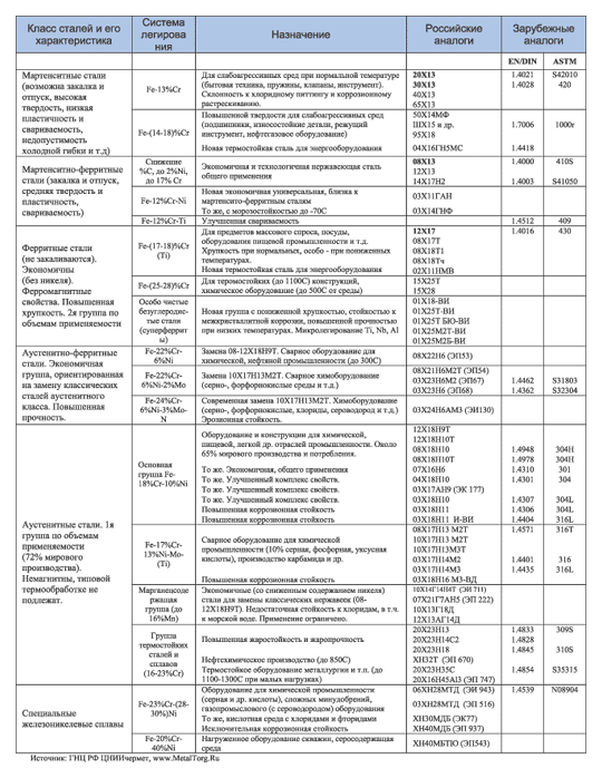 Хорошие российские разработки новых сталей есть, в т.ч. неплохих аналогов современных зарубежных сталей. Более того – часто учтена и российская специфика, например, требование высокой морозоустойчивости, коррозионной стойкости в серосодержащих продуктах нефтегазовой добычи и т.д. Однако массовое внедрение новых типов стали на российских металлургических производствах пока ограничено, частично виной здесь недостаточная технологическая готовность производств, частично – неготовность и неинформированность потребителей (особенно новых и зарубежных) о новой продукции металлургов. Так что фронт работ для служб маркетинга металлургии и металлоторговли по специальным сталям просто огромный. Краткая информация по классификации нержавеющих сталей и их областям применения приведена ниже.