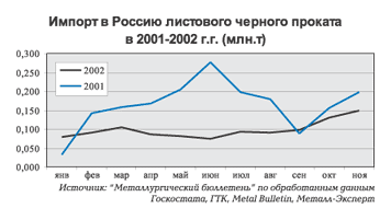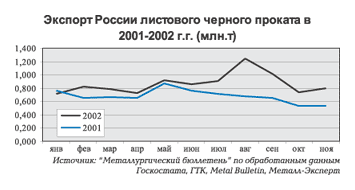 Коротко ее можно сформулировать так. Снижение потребления металла всеми базовыми отраслями экономики России в 2002 году (машиностроением, строительством, нефтегазовым комплексом и ТЭК) составляет более 10% по сравнению с 2001 годом.