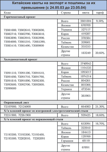 В конце мая Правительство КНР утвердило разрешение на беспошлинный импорт в общей сложности 2,88 млн. тонн г/к стального плоского проката и 5,74 млн. тонн х/к стального плоского проката. Поставки эти должны быть осуществлены до 23 мая 2004 года. Вновь для России (как и для ряда других стран) выделена отдельная доля в рамках общих импортных квот.
