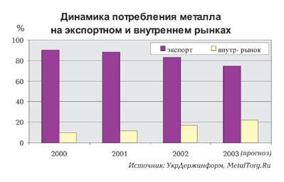 Но есть на украинском рынке металлов и явная местная специфика. Ни для кого не секрет, что металлургическая отрасль Украины является первой по важности отраслью в национальной экономике, полностью ориентирована на экспорт и приносит около 40% валютной выручки для страны. Частично «подтолкнул» ее к экспорту и известный эксперимент в украинской металлургии. Участникам эксперимента в ГМК была реструктурирована задолженность и предоставлен ряд льгот по уплате налогов и сборов, что существенно улучшило их финансовое положение. Более того, получив эти льготы, металлургические предприятия получили и более конкурентные экспортные цены и сразу ринулись осваивать рынки западные, оставив в одиночестве рынок внутренний. Позже они «нахлебаются» проблем с возвратом НДС, и экспорт окажется не таким уж и выгодным. Но это будет позже, а во время проведения эксперимента внутренний рынок насыщался металлургической продукций по остаточному принципу.
