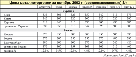 Мы приводим на рис. 4 сравнение цен украинской и российской металлоторговли по основным позициям на октябрь 2003 года.