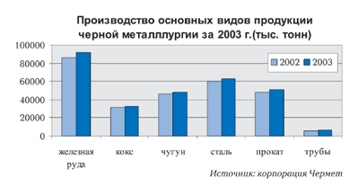 В целом 2003 год для предприятий черной металлургии РФ смело можно назвать удачным и по производственным, и по финансовым показателям. Черная металлургия, как базовая отрасль, продемонстрировала высокие темпы роста: показатели 2003 года составили 108,9% к уровню 2002 года. Самые высокие темпы роста показали трубная промышленность (+18,2%) и производство ферросплавов (+ 26,5%). Выпуск готового проката черных металлов возрос за год на 5,2% и достиг 51,1 млн. тонн. При этом, главным образом, увеличилось по сравнению с предыдущим годом производство листового проката (на 8,6%), а его доля в структуре выпуска гото... ... ...