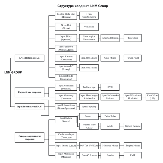 Современная структура холдинга LNM Group делится на два крупных подразделения – LNM Holdings и Ispat International. В состав этих двух гигантских компаний, штаб-квартиры которых находятся в Лондоне и Роттердаме, где председателем правления и президентом подразделений является г-н Миттал, входит около 20 дочерних компаний из 12 стран мира (см. рис.1). Более 110 тыс. чел. работают на предприятиях LNM Group в таких странах как США, Канаде, Мексике, Великобритании, Германии, Франции, Казахстане, Алжире, Румынии, Чехии, ЮАР, Польше и Индонезии. Каждое производство отличается интегрированной инфраструктурой, объединяющей угольные шахты, месторождения железной руды, электрогенерирующие мощности и транспортное оборудование.