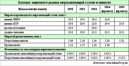В обзоре «Рынок никеля и нержавеющей стали вновь не прогнозируем» (от 16 марта 2004 года) мы уже отмечали противоречивость оценок этого рынка. Разница данных MEPS и ISSF достигала 15% по объемам мирового производства 2003 года и различалась вдвое по темпам роста. Там же – отмечалось особая неточность данных по китайскому рынку. Напомним, что собственное производство Китая в прошлом году по данным разных источников оценивалось в 0,7-1,8 млн.тонн, а общее потребление в 2,9-4,2 млн.тонн.