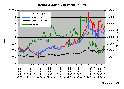 За пять дней с 20 по 24 сентября 2004 года цены на никель LME увеличились на 14% и достигли отметки $14650 за тонну, что стало максимальным недельным увеличением с 1990 года. Пока это далеко от абсолютного рекорда, поскольку в самом начале этого года его цена достигала $17770 за тонну. Однако тогда, 6 января, складские запасы LME составляли 23886 тонн. Сейчас они составляют менее 60% от уровня начала года.