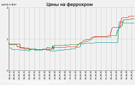 Другой важнейший компонент нержавеющих и специальных сталей – хром, также не остался в стороне от новой коньюктуры рынка. В начале 2004 года цены на феррохром «дружно» подскочили едва не вдвое. К примеру, феррохром (8%C, 60%Cr) на условиях поставки FOB Китай, с 6 по 19 февраля 2004 года подорожал на 90%. Сейчас цены на хромовое сырье не просто стабильнее, чем цены на никель – они «не отступают ни на шаг».