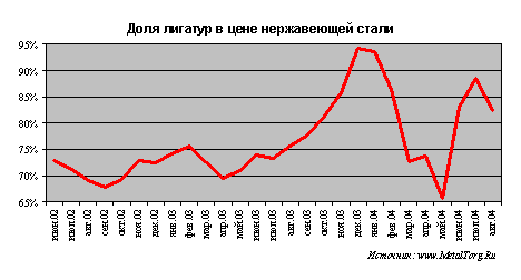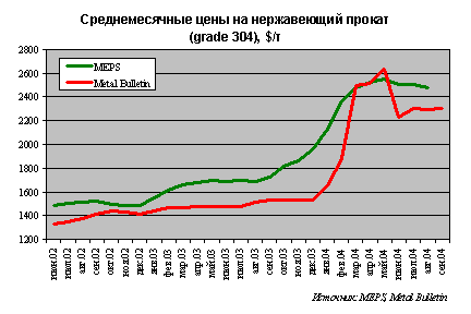 Даже если допустить, что крупнейшие сталелитейные компании купят никель со скидкой к биржевым ценам, все равно придется признать, что доля затрат на никель и хром в 2004 году не раз «зашкаливала» за 80-90% в конечной цене (по данным MEPS и Metal Bulletin) на нержавеющую сталь.
