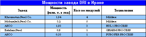 Установки прямого восстановления (процессы восстановления газом в шахтных печах: Midrex, Xyl III, Purofer) в Иране уже имеют общую мощность - 7 млн.тонн.