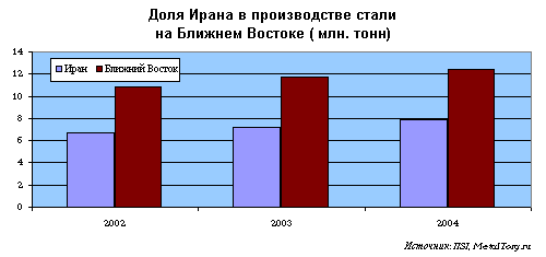 Прирост иранского производства стали за последние три года составил в среднем 8-10% в год. И если в мире доля иранской металлургии составляет менее 1%, то в регионе Ближнего Востока ее доля рынка уже превысила 63%.