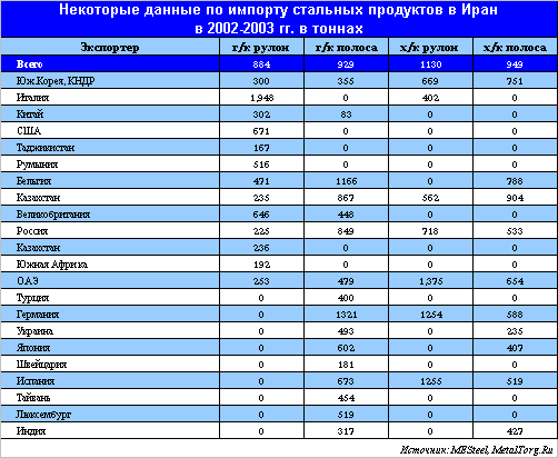 Оценки по 1382 иранском году (21.03.2003 г. – 21.03.2004 г.) есть. Статистика сообщает, что для производства металлопроката в Иран за это время было импортировано 1, 8 млн. т стальных заготовок, из которых около 1 млн. т было переработано на государственных предприятиях.