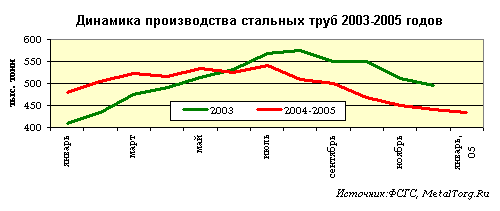 Тенденция к спаду производства, началась летом и продолжилась до конца года. Тогда, в середине 2004 года, трубники объясняли сокращение объемов производства резко восросшей ценой на сырье, поступающее с металлургических комбинатов. И для того, чтобы остаться на уровне рентабельности, они вынуждены были сокращать производство.