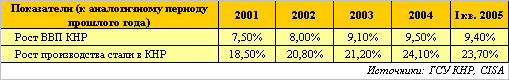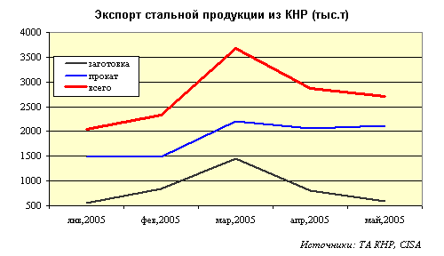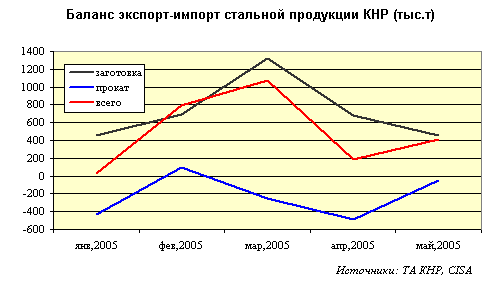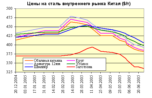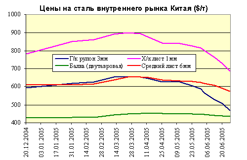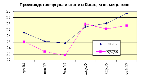 В целом за январь-май 2005 года по данным IISI производство стали в Китае выросло на 18% до 29,73 млн м.тонн и чугуна на 18% раз до 27,7 млн м.тонн. Это вновь вдвое больше роста ВВП, поэтому производство в черной металлургии Китая начало уверенно превосходить внутренний спрос в стране. В первую очередь перепроизводство отразилось на рынке стальной заготовки, далее - простых видов сортового проката, далее - горячекатаного листа и рулона.