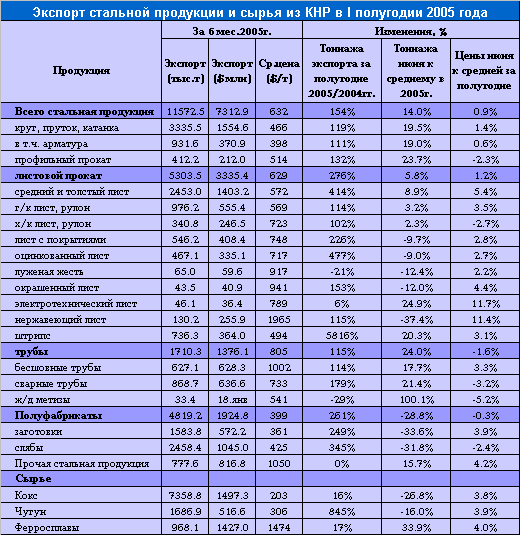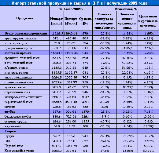 CISA 2 августа сообщила ряд итоговых сводок и оценок. Совокупный объем стального импорта КНР в первом полугодии 2005 года упал по сравнению с тем же периодом прошлого года на 4,82 млн. т до 13,22 млн. т. Экспорт, напротив, вырос на 153,7% до 11,57 млн. т. Чистый стальной импорт (его превышение над экспортом) сократился, в годовом исчислении, на 87,76% до 1,65 млн. т.