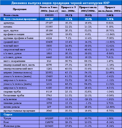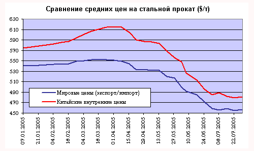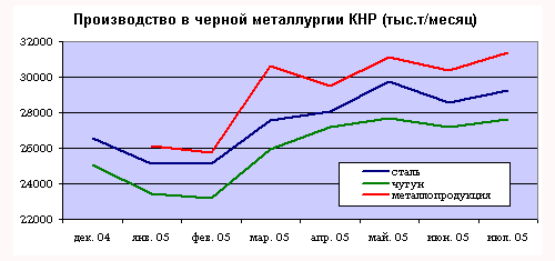 Опасения металлургов всего мира о конкуренции с дешевой китайской стальной продукцией не проходят. Несмотря на длительную работу властей КНР по «торможению» развития национальной металлургии, темпы роста этой отрасли остаются очень высокими. По итогам прошлого года Китай выпустил четверть мирового производства стали, по итогам первого полугодия 2005 года – 30%, в июне – 32%, а по предварительным оценкам июля 2005 года – способен выйти на треть(!) мирового стального производства.