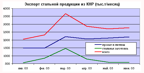 Вот вырисовывается главный источник всех тревог – типовая статистика. По сравнению с уровнем I полугодия 2004 года рост экспорта стальной продукции из КНР в I полугодии 2005 года составил +154%. А по сумме всех видов штрипса – вырос почти в 60 раз(!). Падение объемов вывоза по паре позиций из двадцати (ж/д метизы и жесть) многих уже не успокаивает. А напрасно, сравнение цифр с почти «нулевым» уровнем всегда дает невообразимый рост.
