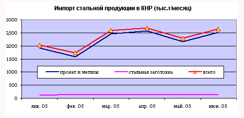 Ввоз стального проката в КНР в этом году также заметно увеличился. Ежемесячный импорт с января до июня 2005 года вырос на 30% (до 2,52 млн тонн в месяц). Вырос даже импорт заготовки и слябов (на 22%), хотя всего лишь до 129,59 тыс.тонн в месяц. В общей сложности, ежемесячный импорт стали и металлопродукции в КНР с начала года вырос на 31% (до 2,64 млн тонн в месяц), практически полностью компенсировав рост экспорта.