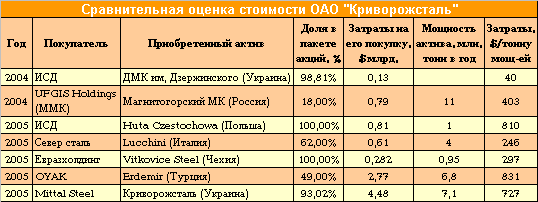 По условиям выигранного конкурса, кроме затрат на приобретенный пакет акций ($4,8 млрд.), Mittal Steel взяла на себя обязательства по инвестициям в комбинат в сумме $2,3 млрд. Любая прямая оценка означает, что окупаемость всех этих вложений в «Криворожсталь» выше 20 лет(!).