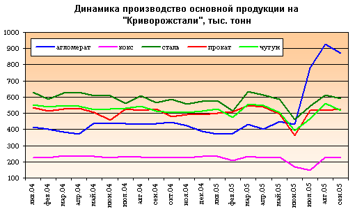 Производственные мощности Криворожстали позволяют ежегодно выпускать более 6 млн. тонн проката, около 7 млн. тонн стали и более 7,8 млн. тонн чугуна, однако месячная статистика его производства не вполне стабильна. В целом за 9 мес. производство стали достигло 5,2 млн. тонн, а проката – 4,5 млн. тонн. При этом, по отношению к аналогичному периоду 2004, года производство кокса, стали, чугуна и проката снизилось на 8%, 5%, 6%, 3% соответственно. А выпуск агломерата наоборот – подскочил на 34%.