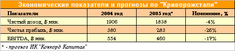 Финансово-экономические показатели комбината на протяжении 2005 года по сравнению с прошлым годом снижаются. Прогнозируемая чистая прибыль в 2005 году составит около $280 млн. Отметим, что прибыль «Криворожстали» за последние 4 года (2001-2004) составила 4.16 млрд гривен – около $ 780 млн. (в среднем $ 195 млн. в год)