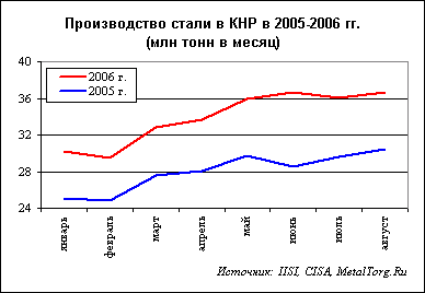Металлургия, естественно, не исключение. Выйдя на треть мирового производства стали, эта страна из нетто-импортера этой продукции превратилась в нетто-экспортера. И если верить статистике, то процесс этот идет неуклонно. По всем прогнозам к концу следующего года Китай может экспортировать до 100 млн. тонн стали в год.