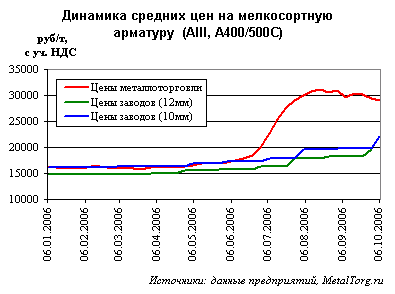 В итоге пройден и пик цен на арматуру в металлоторговле. С конца августа трейдеры систематически снижают свои запредельные цен в прайс-листах на мелкосортную арматуру, пытаясь оживить продажи, но результат не слишком велик. На начало октября снижение цен арматуры в металлоторговле Центрального региона РФ уже достигло 5-10% по сравнению с уровнем роста цен в разгар сезона (см. рис. 1), причем этот процесс продолжается.