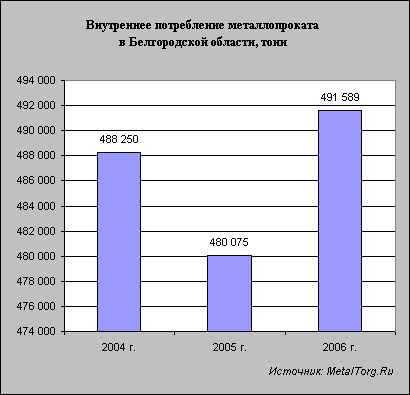 В 2006 г. внутреннее потребление проката черных металлов в Белгородской области составило 491,6 тыс. т, что лишь на 2% выше уровня 2005 г. (480 тыс. т).