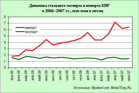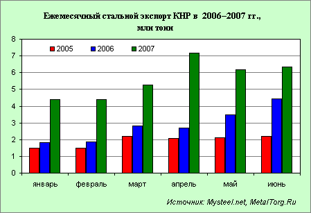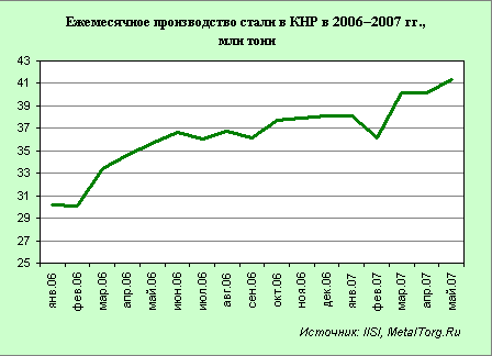 Действительно, за первое полугодие текущего года темпы роста производства стали в КНР почти не уступают прошлогодним. Среднемесячный прирост производства стали за январь–май 2007 г. вновь близок к 2%.