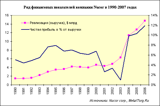 Компания Nucor нашла выход в еще одном этапе развития – производстве из металлолома плоского проката широкого назначения, использовании DRI, а также в поглощении конкурентов. Рост продаж и прибылей в 2004–2006 гг. показывает на прекрасную (опережающую) адаптируемость Nucor к изменениям конъюнктуры.