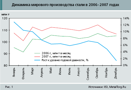 В январе–марте 2007 г. объемы выпуска стали превысили уровень годичной давности на 10–13%. В течение года упорно доминировал стабильный год от года «сезонный фактор», однако темпы развития мировой металлургии неуклонно падали (рис. 1).