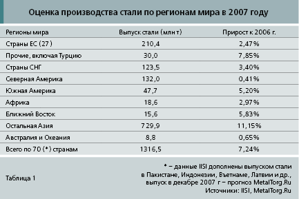 По оценке от 14 декабря Организации экономического сотрудничества и развития (ОЭСР), мировое производство стали возрастет в 2007 г. по сравнению с предыдущим годом на 8%, до 1,33 млрд т. Это весьма близко и к нашим оценкам (таблица 1).